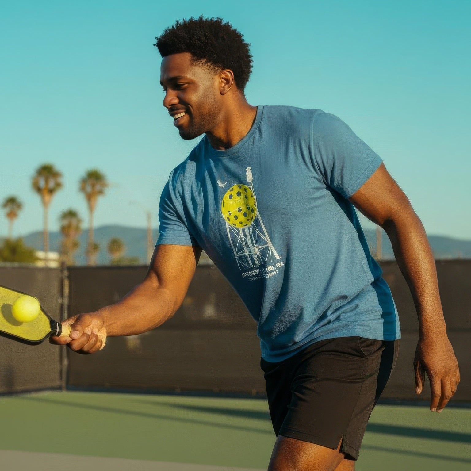 This isn’t just a tee — it’s a tribute. Inspired by the iconic water tower that watches over the Founders Courts at Battle Point Park on Bainbridge Island — the birthplace of pickleball — this graphic swaps the water tank for a pickleball and tags the structure with two simple phrases: Dream and Look Up.